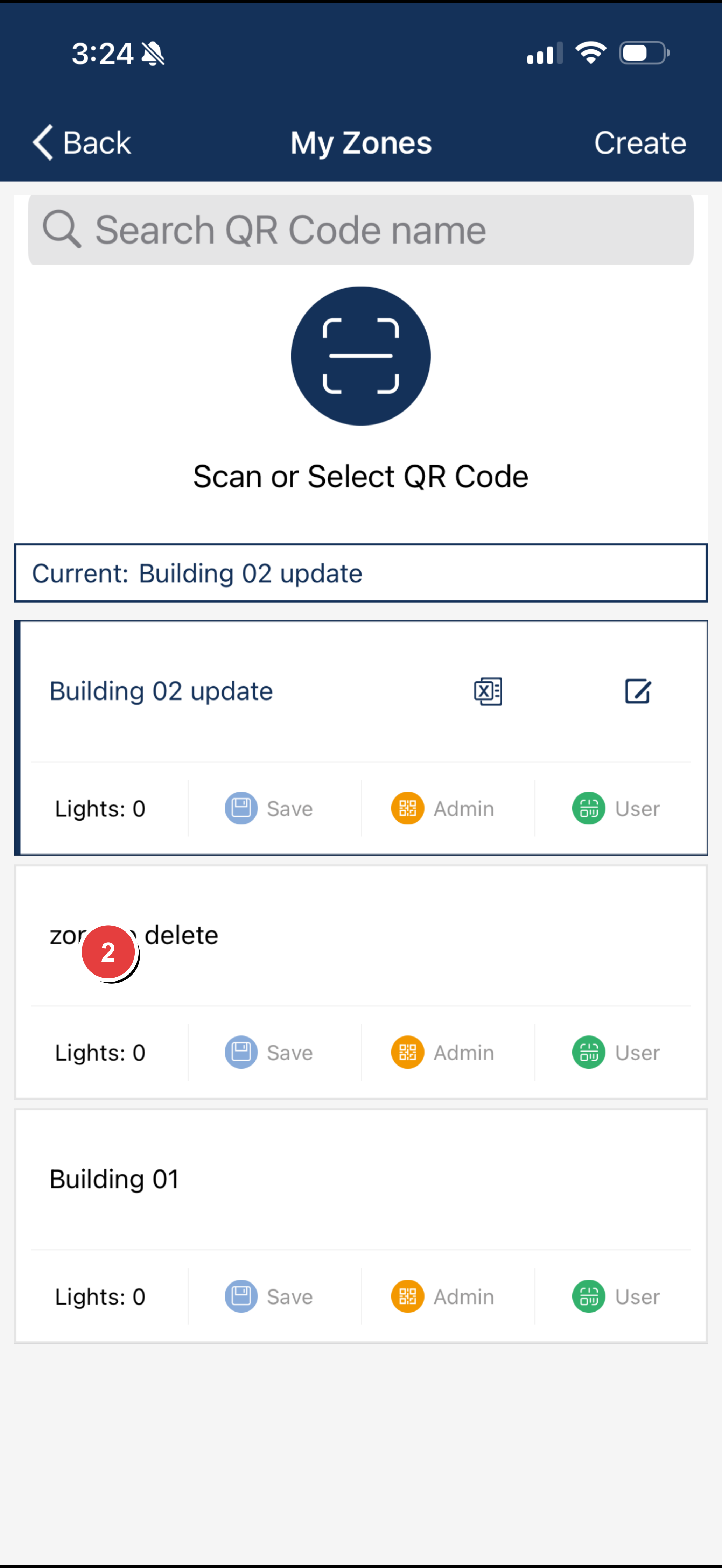 Your new zone now appears in the My Zones list. The app automatically generates two QR codes for this zone—one for Admin access and one for User access.